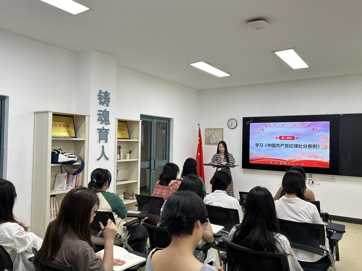 党支部副书记贺新雅领学《中国共产党纪律处分条例》(以下简称《条例》)第4—7章内容。《条例》是管党治党的重要基础性法规,修订《条例》,从党章总源头出发,坚持全面从严,体现系统观念,做到科学立规,不断扎紧织密制度笼子。她表示作为学生党员在日常生活学习中要高标准、严要求,时刻规范自身言行,做到自警、自励、自省、自律,发挥先锋模范作用。