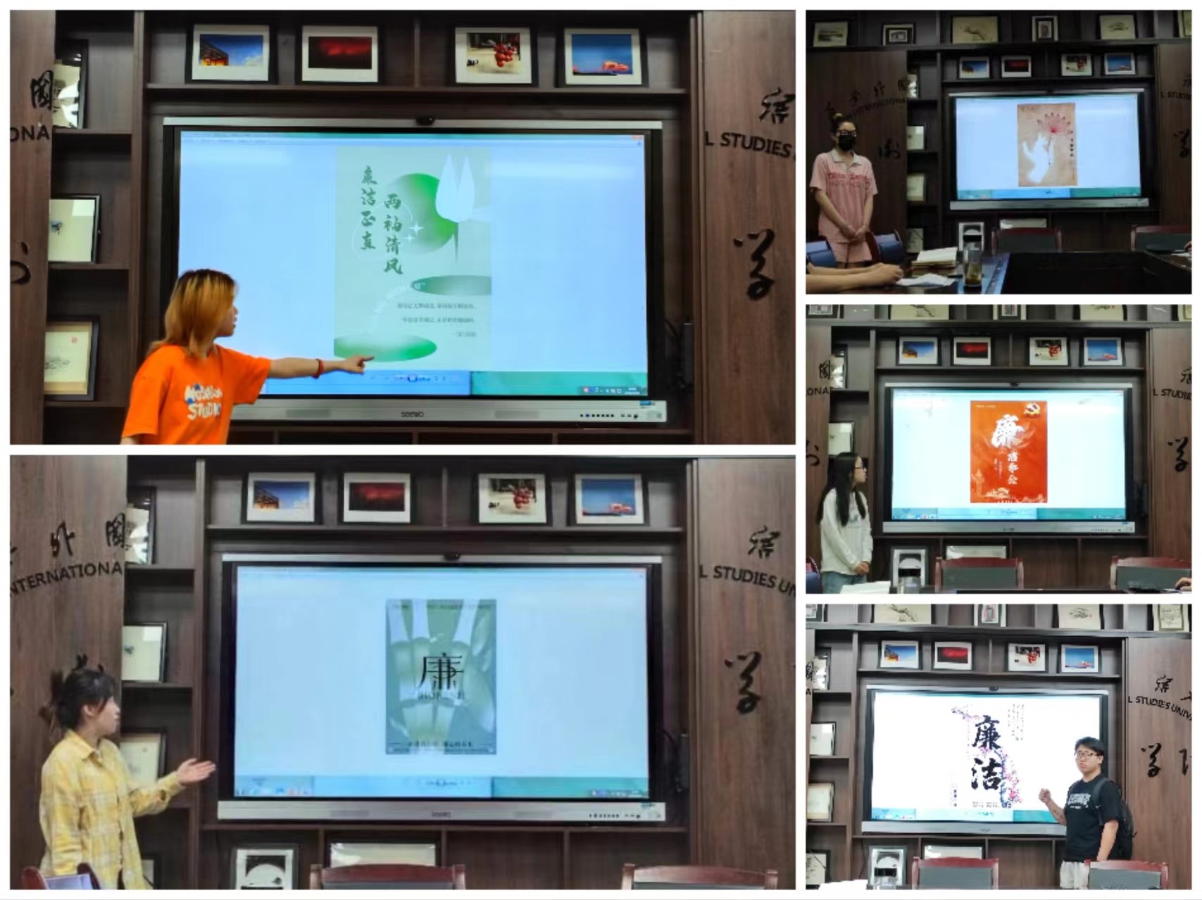 视觉传达设计专业本科生党支部书记冯鑫介绍了学生党员们围绕“廉洁文化”主题进行的艺术创作。部分学生代表现场介绍了自己的作品,并结合创意理念分享了自己的学习心得。教工第二党支部的党员教师就作品的创作形式、主题选取和内容表达等方面进行了点评。学院党委副书记屈晓对学生们的学习态度和创作热情表示肯定,作品能紧扣主题,将廉洁文化以艺术形态呈现,具有观赏性和教育意义。