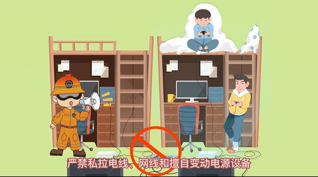 遵守“人走电关”原则,避免电器长期通电。人离关灯、关电源、关水,各种用电设备(特别是空调、饮水机等大功率电器),宿舍内成员全部离开时必须切断所有电器电源,尽可能减少火灾隐患的存在。