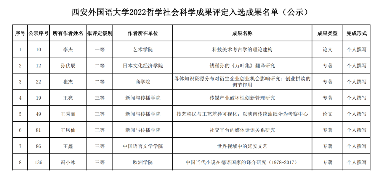 2022年度西安市哲学社会科学优秀成果奖评定结果公布,我校共8项成果入选,其中一等奖1项,二等奖2项,三等奖5项。本次获奖是我校历年来最好成绩,取得了获奖数和高级别奖项的双重突破。开云体育