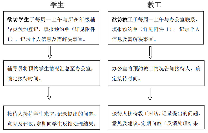 处、科级干部每周固定一小时作为接待时间,接待学生来访,听取学生的意见和建议,记录学生在提出的问题,每月将问题汇总至学院办公室,并及时向学生反馈整改进度,具体流程见下图。