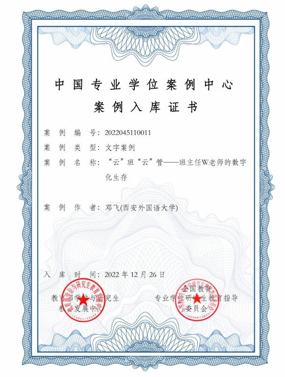 邓飞老师提交的《“云”班“云”管——班主任W老师的数字化生存》通过个人申报、学校初选、全国评审,被顺利收录至中国专业学位教学案例中心案例库,这是我校专业学位该领域首篇收录入库的国家教学案例。
