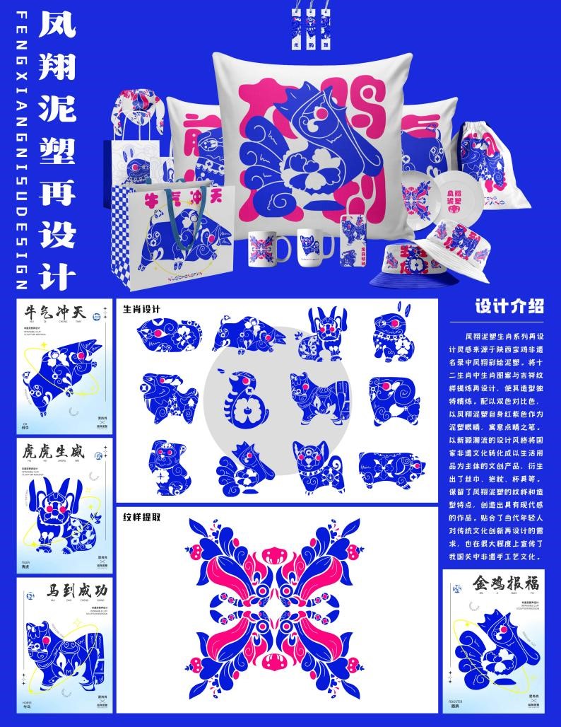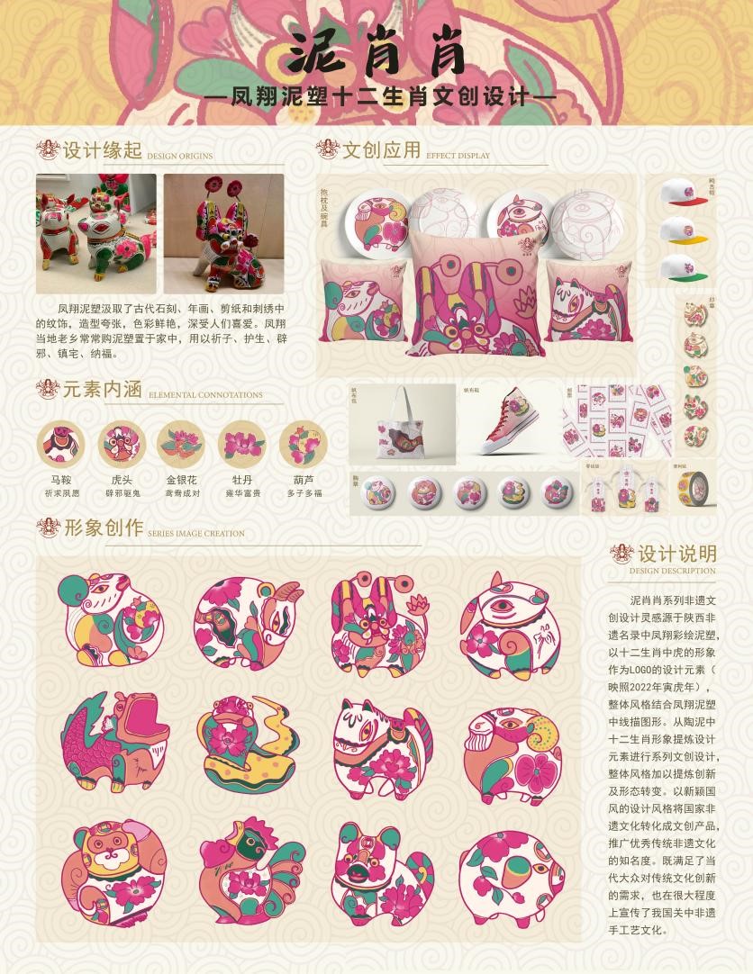 参赛作品围绕陕西宝鸡非遗名录中的凤翔彩绘泥塑,从陶泥中十二生肖形象提炼设计元素进行系列文创设计,以新颖的国风设计将国家非遗文化转化成文创产品。作品在贴合当代年轻人对传统文化再设计需求的同时,也宣传了关中非遗手工艺文化。