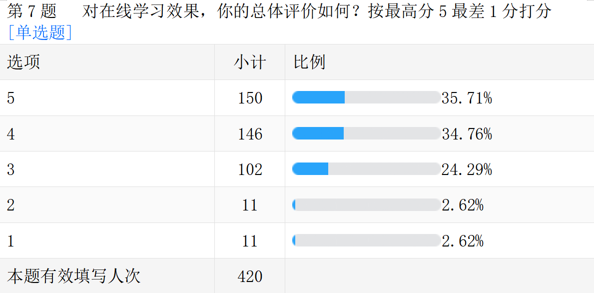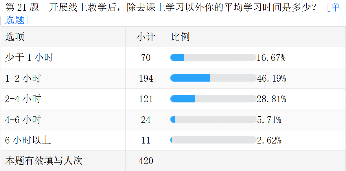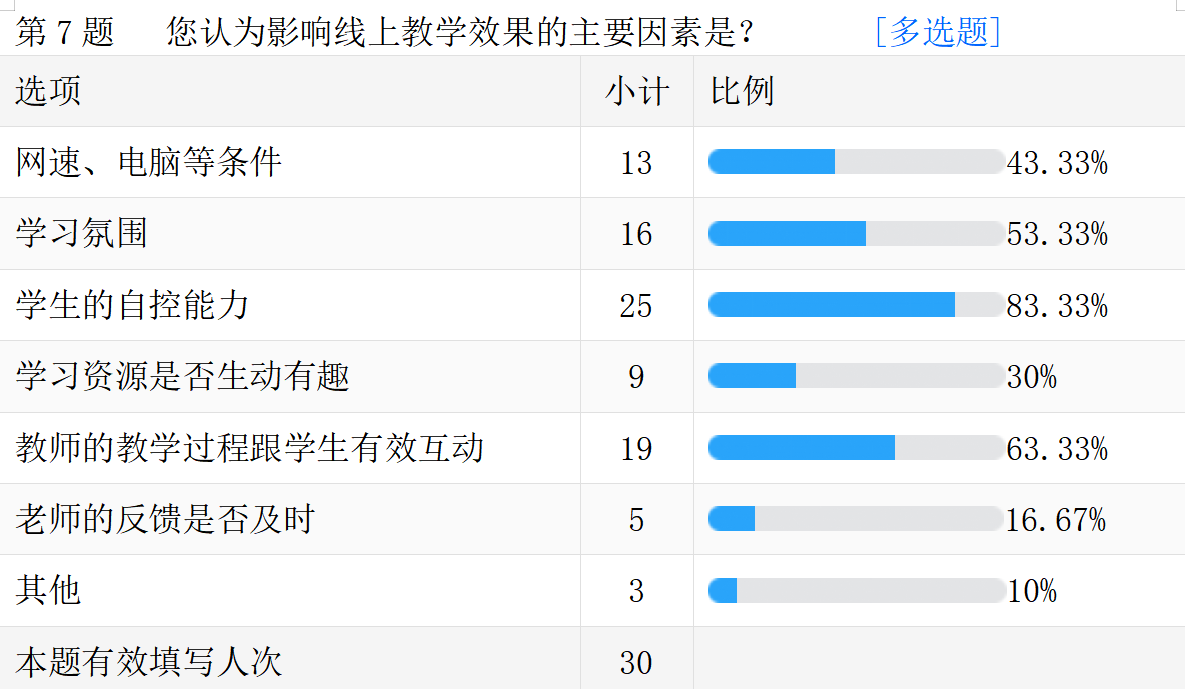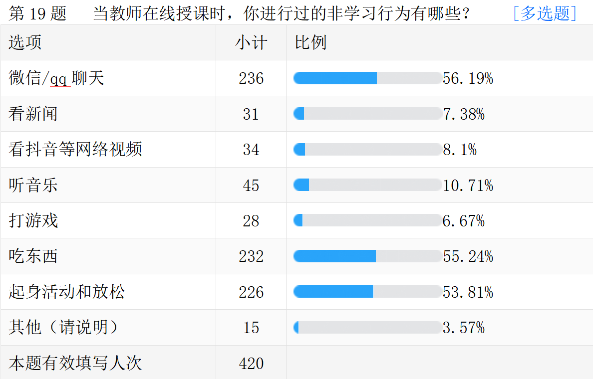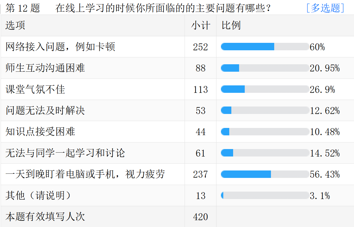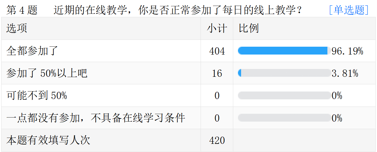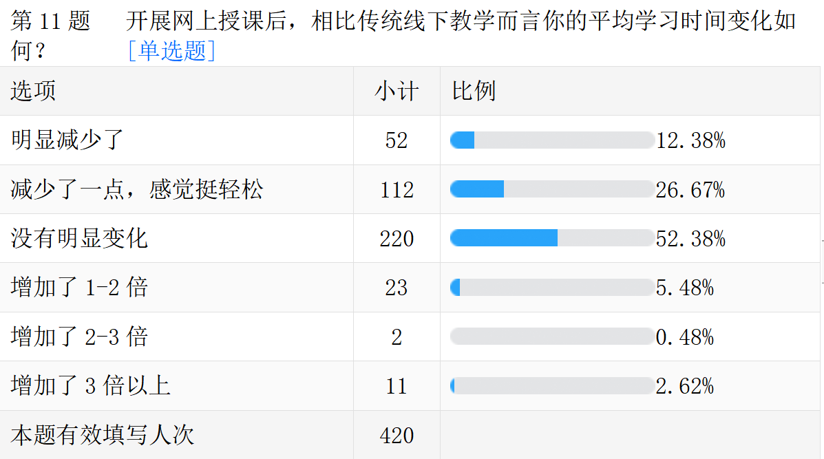 线上教学的真实情况。以下是调查问卷的部分数据汇总。