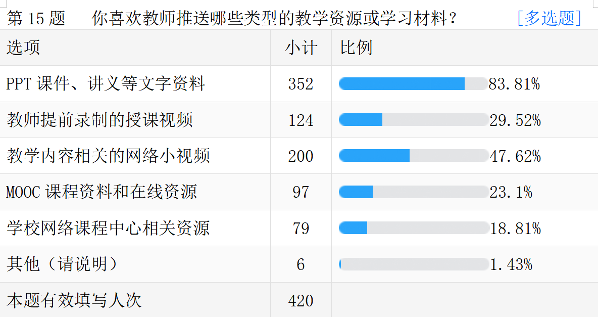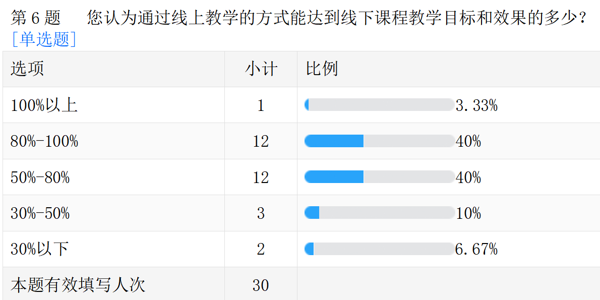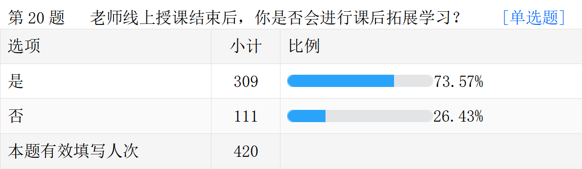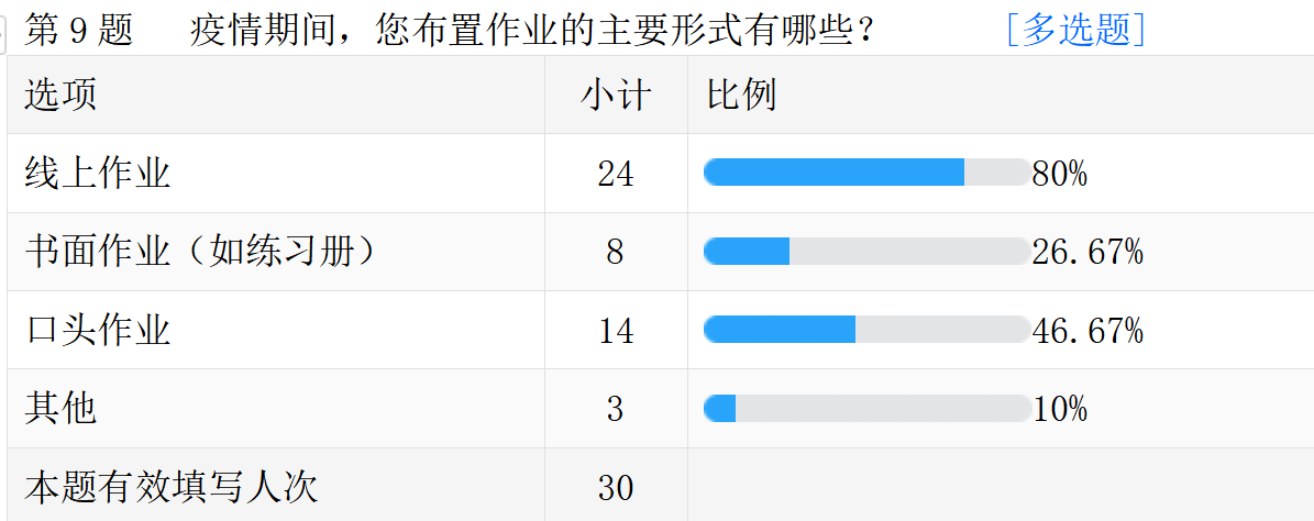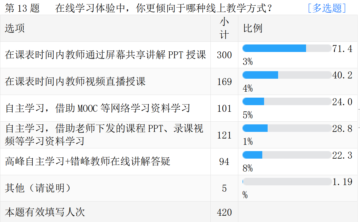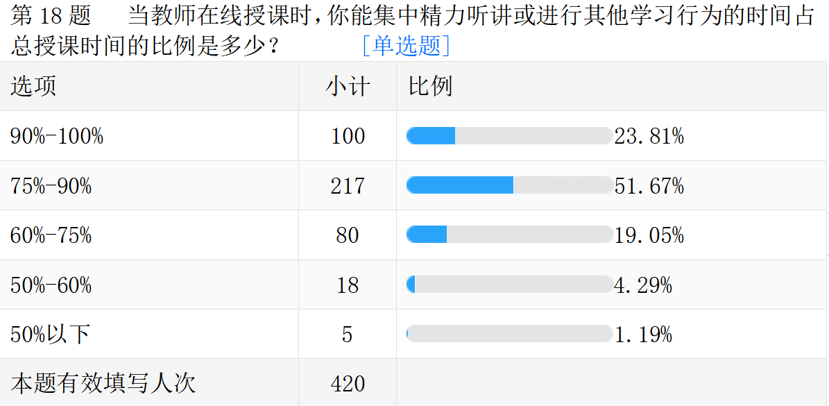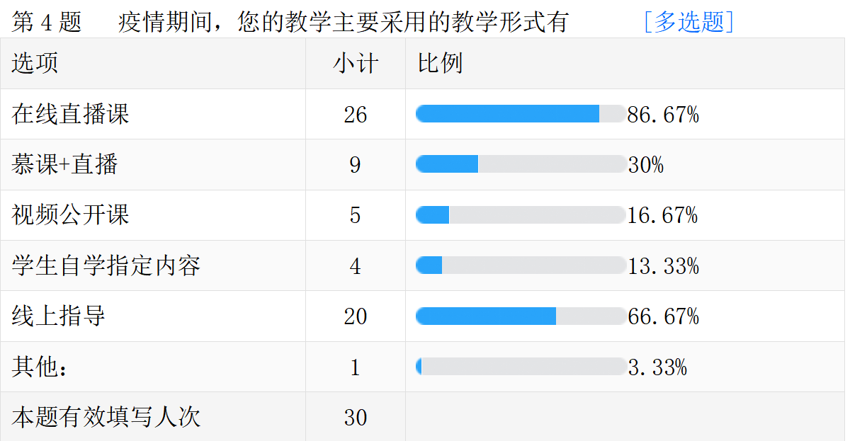 线上教学的真实情况。以下是调查问卷的部分数据汇总。