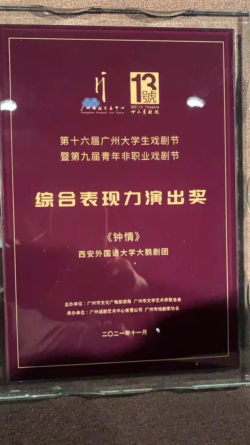 戏剧专业研究生原创并演出的作品《钟情》在第十六届广州大学生戏剧节暨第九届青年非职业戏剧节决赛中获得综合表现力演出奖。