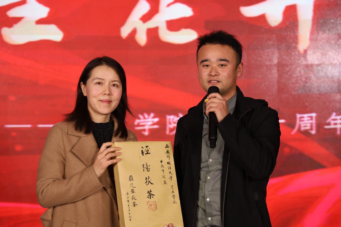 2013届苗浩及2015届常鑫作为优秀毕业生代表登台向学院送上贺礼。苗浩学长带来了北京大学历史文化研究所所长雷原教授为西外艺院10年庆的题辞——“弘道于艺,育人在学”;而常鑫学长则带来了自主创业项目“泾阳茯茶”自己亲手做的第一块茶饼。学长谈到,学艺者以博闻多识为工,以家国兴亡为责,会在日后的生活和工作中坚持格物致知,知行合一。
