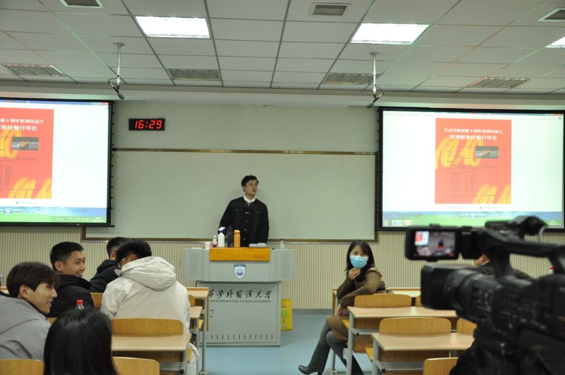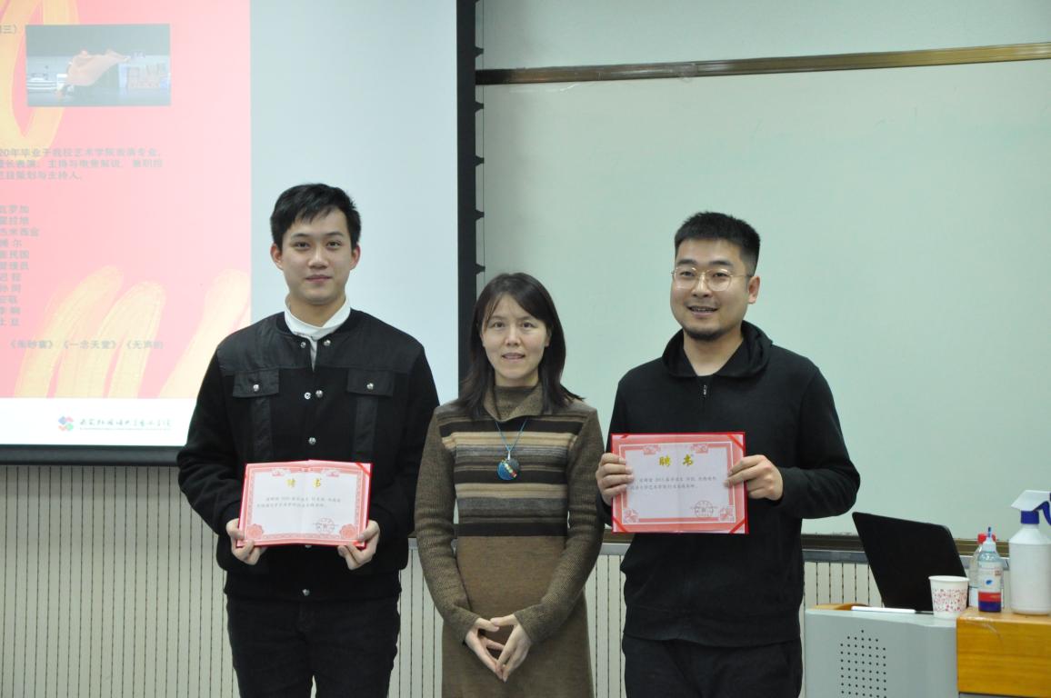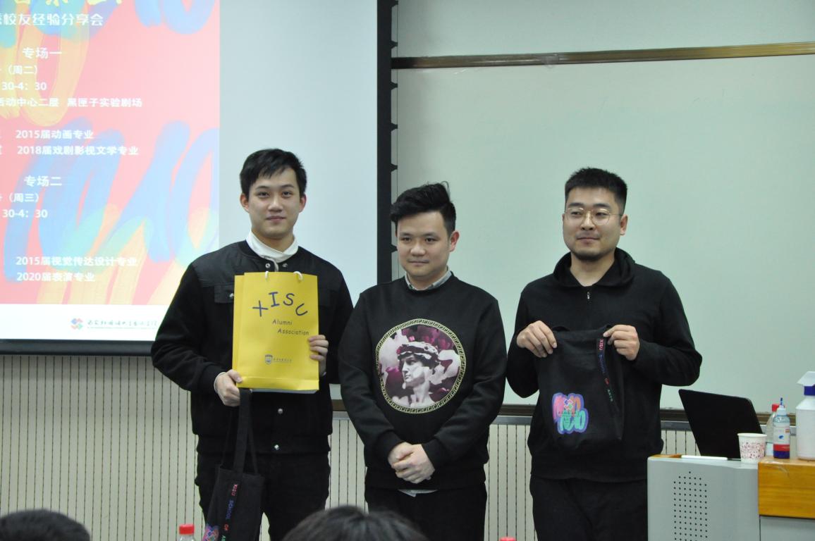 2020年12月2日下午,学院建院十周年系列活动之优秀校友经验分享会第二场在实验楼4区410教室圆满结束。2015届视觉传达设计专业许凯及2020届表演专业刘昊源作为优秀校友参加分享会。院长南华及师生代表齐聚一堂,南院长向两位校友颁发行业实践导师证书,视觉传达设计教研室主任薛璇主持分享会,表演教研室主任陈乃嘉做总结发言。