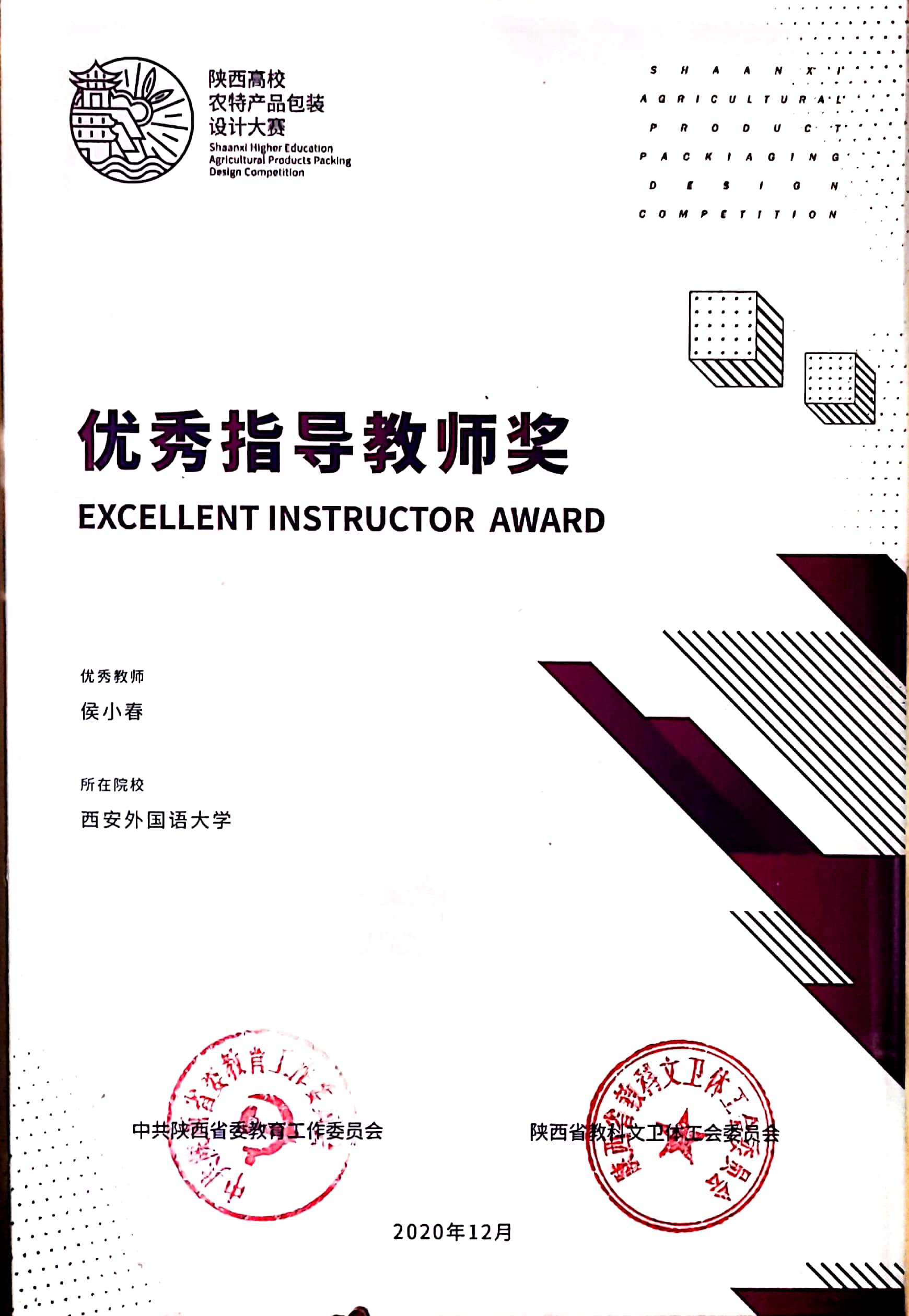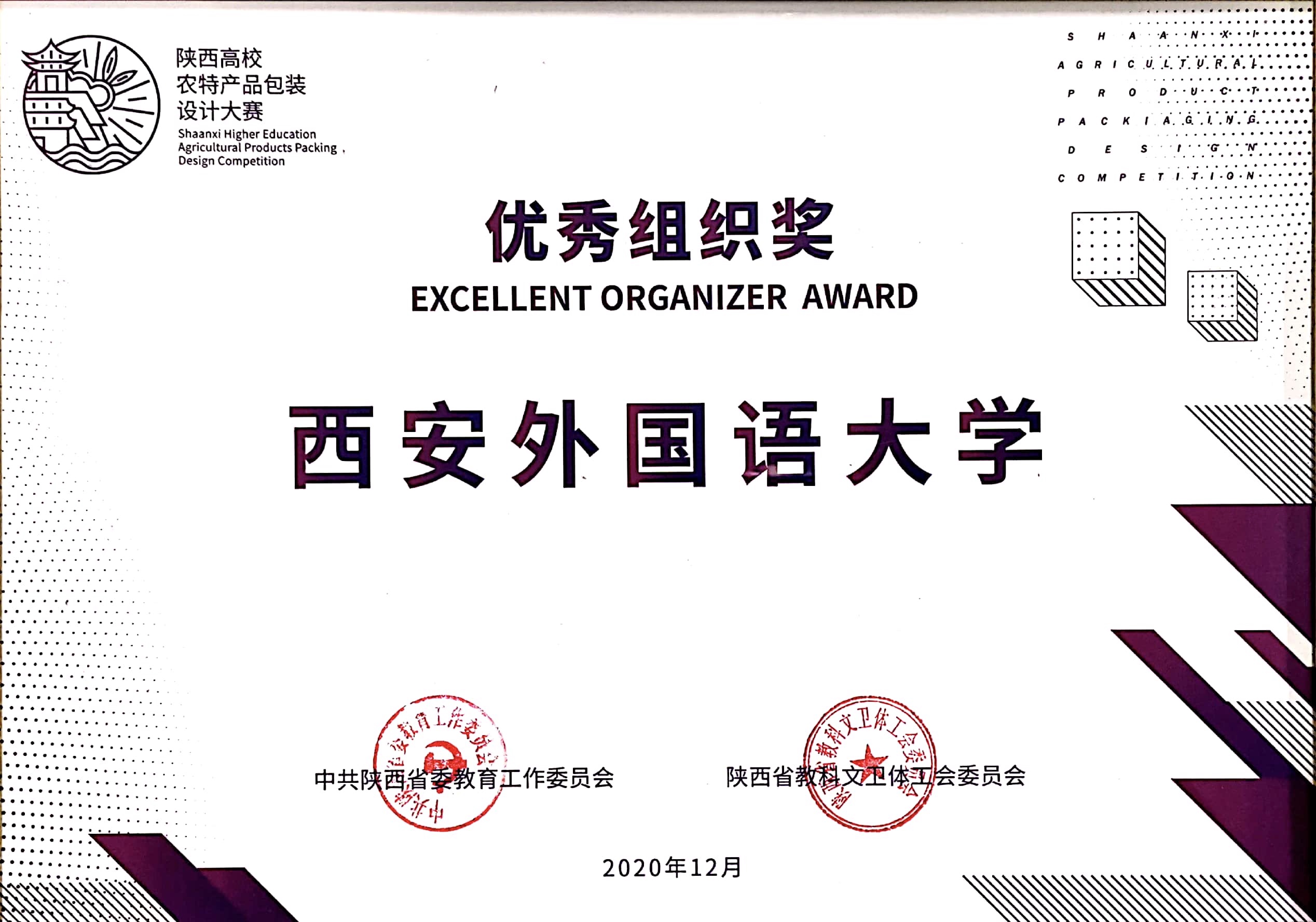 近日,由省委教育工委、陕西省科教文卫体工会委员会组织的2020年陕西高校农特产品包装设计大赛在西安美术学院成功举办。根据《中共陕西省委教育工委关于表彰2020年陕西高校农特产品包装设计大赛优秀个人、优秀指导教师、优秀组织单位的通报》(陕教工【2020】239号),经专家评审,大赛组委会审定,我校师生共有6项作品获奖,其中由刘嘉钰、王伟博同学申报的《山阳挂面》项目获学生组包装设计(自由选题设计)赛道一等奖,现金奖励10000元,该项目指导教师侯小春副教授荣获优秀指导教师,我校荣获优秀组织奖。