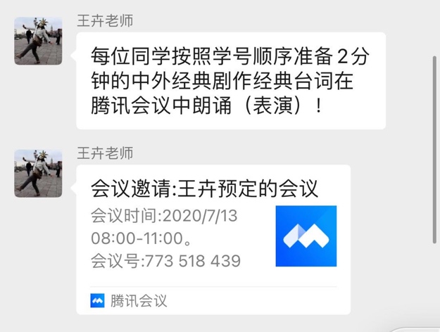 2018级戏剧影视文学专业学生在王卉老师的带领下,也展开了实践周课程《中外经典剧作台词》的学习。同学们通过摄像头,用语言及肢体动作向老师和同学们表演、分享自己喜欢的剧本角色的台词。例如莎士比亚、莫里哀以及关汉卿、曹禺等文学家的作品均被同学们精彩的演绎于课堂之上。与此同时,王卉老师对同学们的表现进行了针对性的点评和指导。