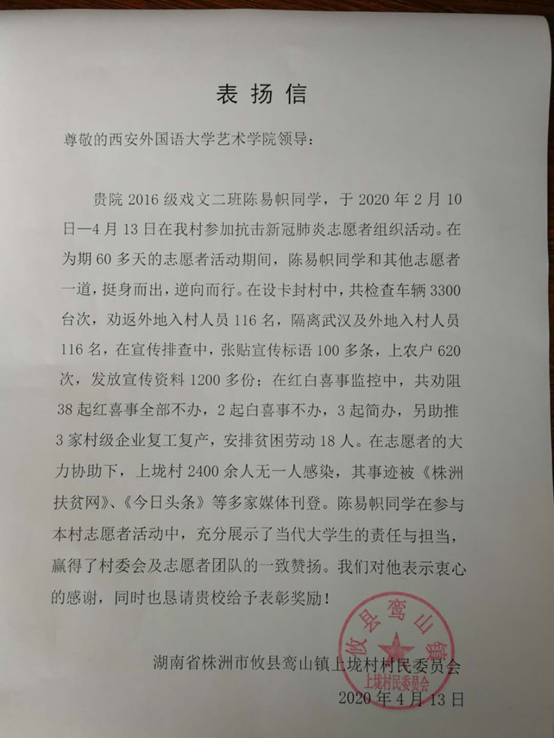 16级戏剧影视文学专业的学生陈易帜能够积极主动加入到疫情防控应急支援服务队伍表达了感谢。在2020年新冠疫情发生期间,该生参加了长达60余天的志愿者服务活动。与当地其他志愿者一同,共检查车辆3300台次,劝返116人次,张贴宣传标语100余条,进户宣传600余次,发放宣传资料1200份。