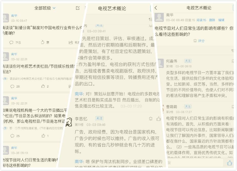 每节课的重点和难点,在讨论区预先抛出,通过分析学生反馈,将其作为重点、难点教学的切入点之一。学生反馈灵活高频,有所思则有所发,小手机作为学习工具功不可没,小劳模一枚。