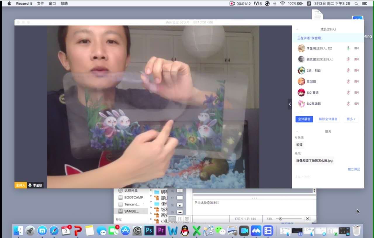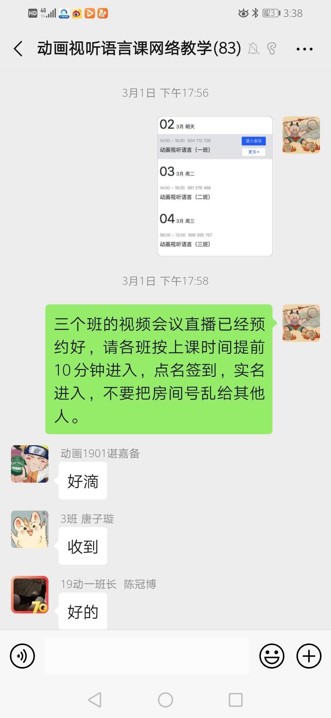 公布腾讯会议的会议号,学生进入。腾讯会议有在线人数的显示,统计到课率。共享桌面,学生端可以看到老师的桌面、操作PPT课件、播放视频、操作动画软件等。学生提问或者回答问题时,可以开麦,老师实时辅导、点评作业等。各门课程互动效果很好。米娜敏老师的二维短片创作课程,采用的是桌面共享的方法来展开教学,学生端与老师实时交流同时操作,如遇问题学生可以直接开麦,现场解答。李金明老师的动画视听语言课,讲到视觉暂留、赛璐璐片等专业识难点时,采用直播现场实物教学展示,讲解知识难点,通过“现场展示+案例视频”结合的形式,效果很好。姚若琳老师的色彩课程,采用了“抗击疫情”主题创作的形式,结合当下的疫情现状分析相关作品,布置了相关课程作业,结合专业特点及工具的局限性,学生可以采用纸质版、电子版两种形式提交。动画教研室其他老师课程、外聘老师的课程都顺利开展,学生普遍反映很好,出勤率基本全勤,极少数同学因为设备、网络等问题,老师也采用了电话、微信、邮件等形式展开课后的教学。