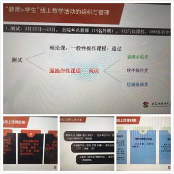 会上,南院长首先传达了2月28日学校教学工作会议的主要精神。她介绍到,本学期学院共开设132门课程,涉及46名教师。全部课程已于2月22-23两日,完成师生线上测试。24-25日完成强操作性课程二次调试。为保证线上教学工作质量,学院特组建由邹满星副院长牵头,程锋、王元方两位教师参与的线上技术支持小组,针对艺术类教学实操性强的特点,做好院内技术辅助。