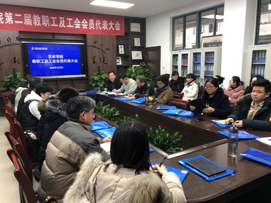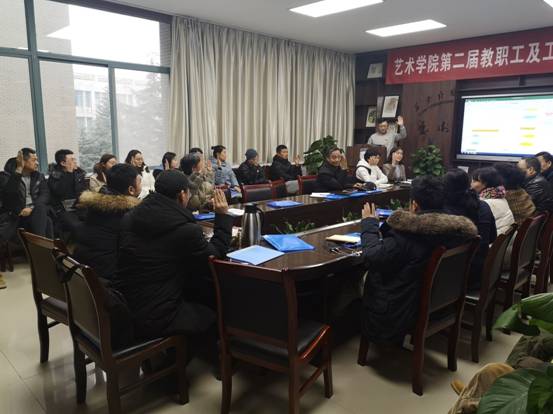 在会议室召开第二届教职工及工会会员代表大会,全体教职工出席,大会由学院分党委书记李敬先同志主持。
