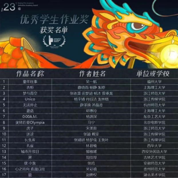 北京电影学院动画学院奖是由北京电影学院动画学院创立于2001年的专业性动画评奖活动,该奖项秉承“鼓励与推动具有独立精神与创造性的动画创作,不断挖掘与充分展示动画作为艺术的多样性,为真正热爱动画艺术的人提供展现自我与互相交流的机会,促进动画创作中的学术发展”的宗旨,以其专业性、学术性、权威性,受到社会各界的一致好评,被誉为中国动画短片的“奥斯卡”。
