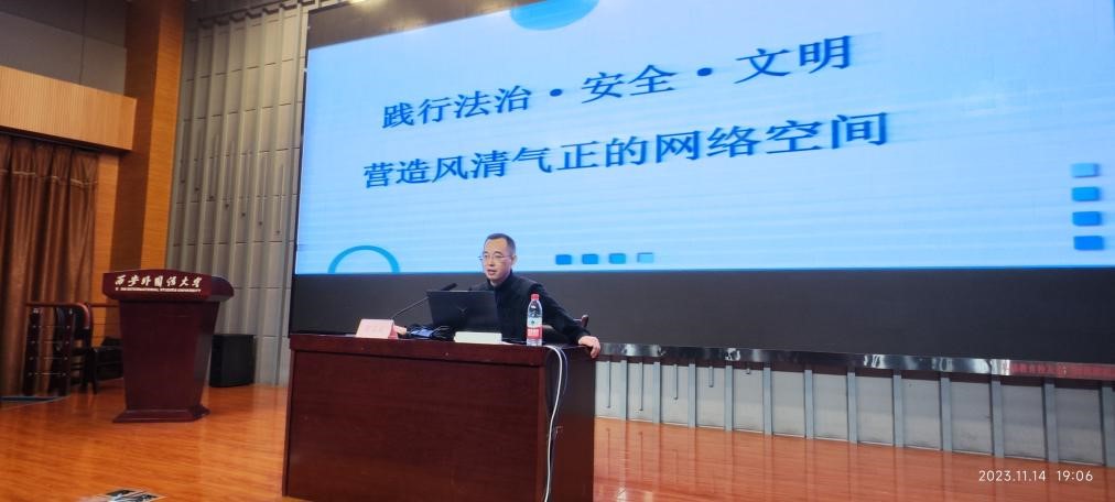 郭富庭以《践行法治·安全·文明、营造风清气正的网络空间》为题,从具体数据和真实案例引入,提出了对于网络空间底线的思考。随后他从网络法治、网络安全、网络文明等三个方面深入浅出地讲解了每个网民在使用网络过程中应遵守的法律法规,以学生生活中容易出现的网络违法行为作为切入点,分析各类可能导致个人隐私泄露、网络暴力、网络诈骗、网络纷争的行为成因及危害,教育引导同学们守好底线、规范行为、文明上网、健康用网,知法懂法用法,善用法律保障自己的合法权益,不做不法分子违法犯罪的工具人,不做网络施暴者、造谣者和违法者,共同维护网络安全,构建网络文明空间。