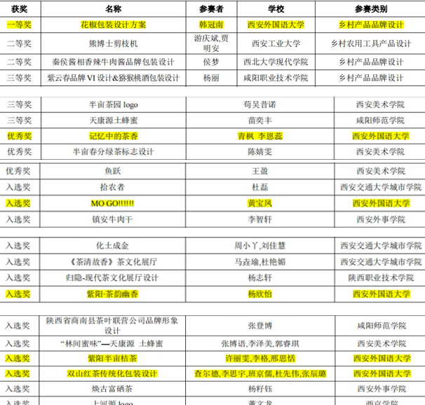 师生发挥专业优势、积极服务地方需求,踊跃参赛,取得了优异成绩。通过比赛,对促进地区农特产品品牌标志创新和包装水平提升,打造陕西特色产业精品品牌,提升“双百工程”工作实效,助力乡村振兴战略深度实施贡献力量。