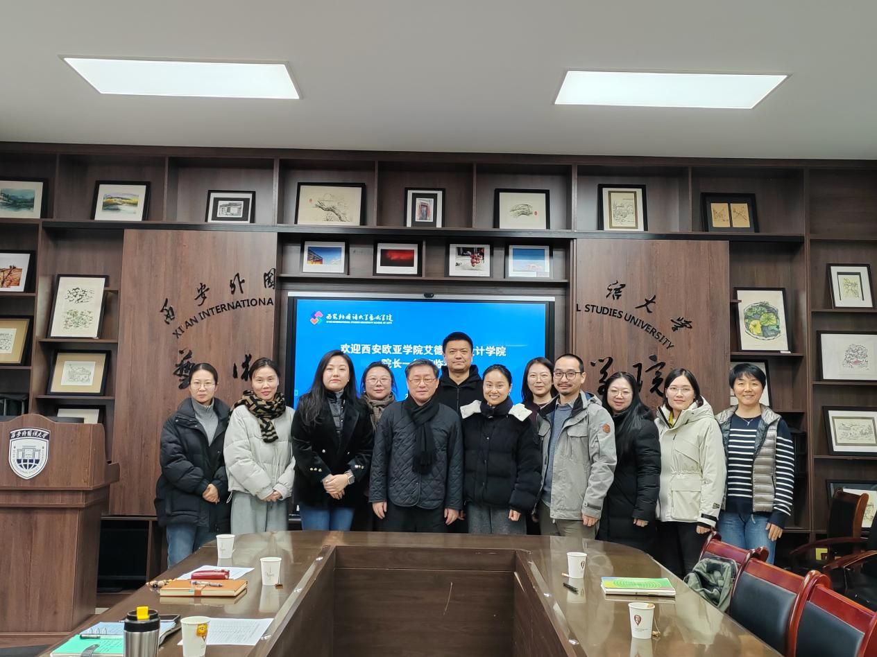 院长李杰,副书记和宁,副院长徐雅宁、屈晓,视觉传达设计专业教研室副教授朴美善、弓淼,教研室主任张家华与西安欧亚学院艾德艺术设计学院副院长(主持工作)王瑛、院长助理郑乐、科研秘书郑希黎、教师刘晓洁一行在开云体育