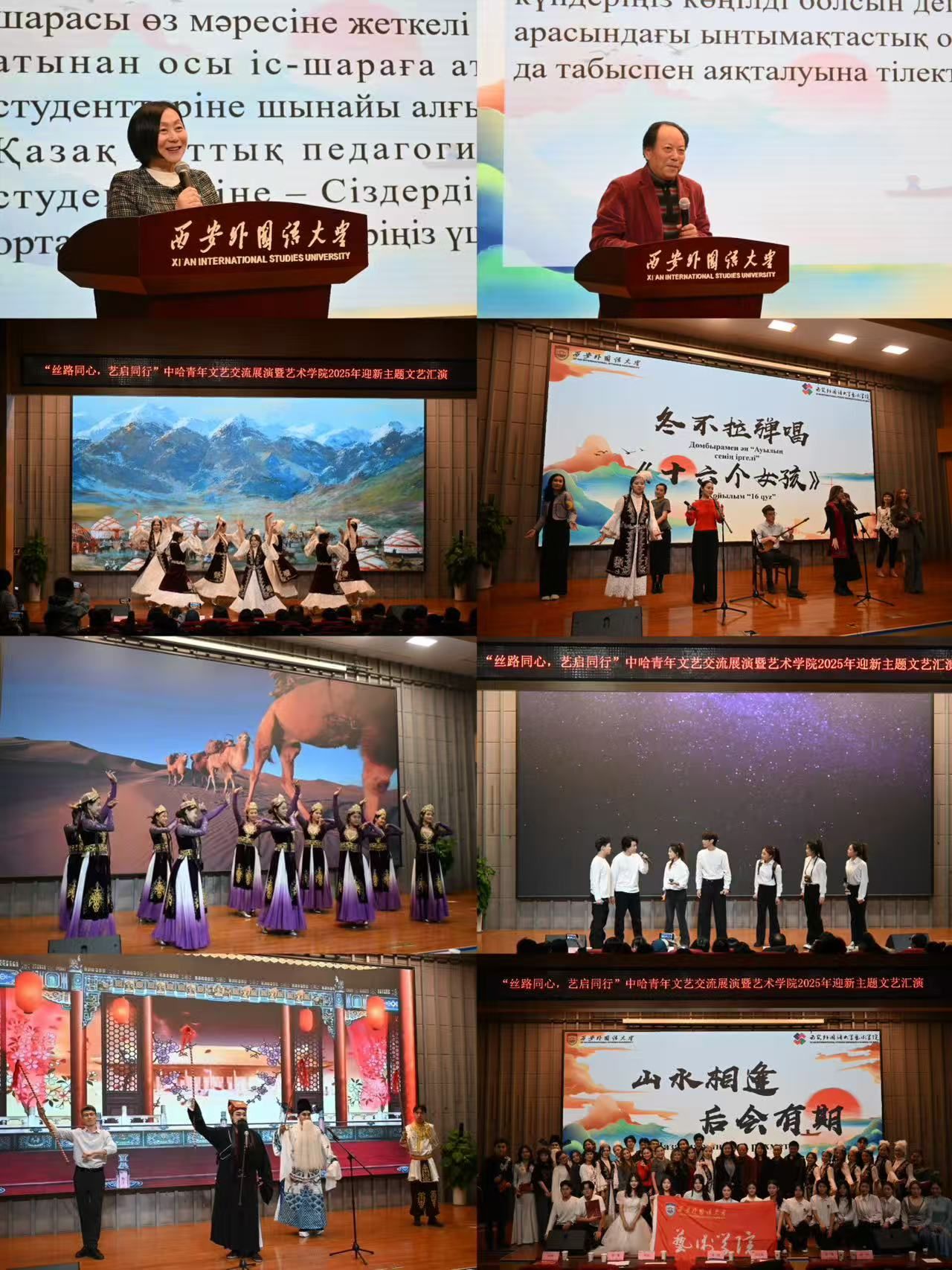 相关负责人共同出席。邓滢副校长表示,青年以艺术为载体传递友好、增进理解,是跨文化交流的生动实践;刘文斌指出,此次交流进一步深化了对彼此文化的认同,巩固了两校友谊。汇演中,我校学生表演的音乐剧《丝路回响》重现古丝路辉煌,哈方学生的冬不拉弹唱《十六个女孩》展现浓郁民族风情,而两国学子共同演绎的《梨园联唱》则跨越文化界限,深刻呼应了“多元共鸣”的活动主旨。