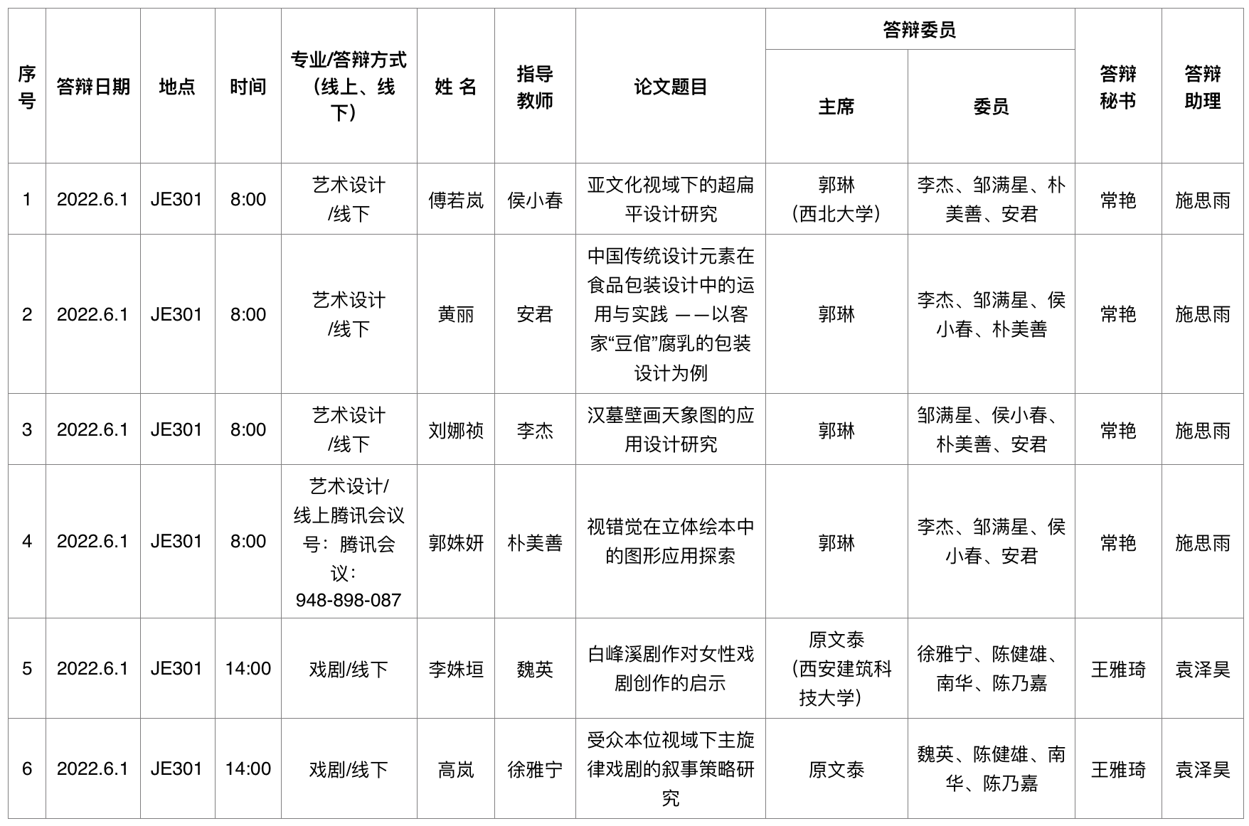 一、答辩安排信息表