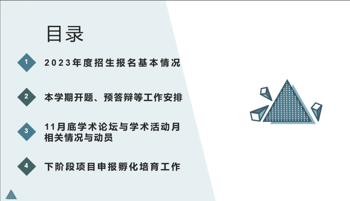 会上,邓飞对近期研究生招生和培养工作进行了情况通报,特别强调要细化各项工作,严格落实学校的各项规定,严把教育教学关,在招生、开题、预答辩等具体工作中强化要求,全面提升研究生的教学质量。