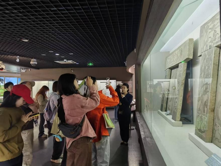 最后一站是榆林市,同学们陆续参观了榆林汉画像石博物馆、陕北民歌博物馆、绥德石魂广场、石狮博物馆、绥德非物质文化遗产陈列馆、以及疏属山上的绥德汉画像石博物馆。汉画像石是榆林地区墓室艺术中最典型的代表,其上平面减地雕刻的精美图案让大家流连忘返,特别是其中《荆轲刺秦王》图案中使用的“断剑引导视线”技法,比西方透视法早千年,启发同学们用符号学分析传统纹样的视觉编码规则。陕北民歌博物馆的展陈通过场景复原与视听体验,使学生从“观看者”变为“参与者”,体验沉浸式叙事。在绥德县文化馆非遗办主任延保霞的带领下,同学们参观了绥德石魂广场的巨型石狮子以及隐藏在石狮内部的博物馆,大大小小的石狮子以“超常想象力+夸张神态”,展现出石狮子独特的地域风格,也为同学们的艺术创新提供了独特的灵感。