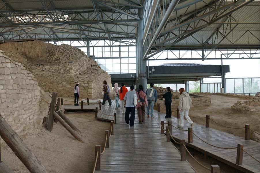 从鄂尔多斯乘车到达神木市后,同学们陆续参观了神木市博物馆以及周边的石峁遗址、高家堡遗址与麟州故城遗址。在神木市博物馆内了解该地域的地质、古生物以及古代遗存的总体面貌。在石峁博物馆和遗址现场体会四千年前的“石筑城防体系”,它证明中华文明在起源阶段已具备与其他古文明比肩的发展高度,为理解早期人类文明的多样性提供了东方样本。在麟州故城考古现场,同学们在陕西省考古研究院考古队长胡春勃的讲解中,参观了唐宋时期北方军政要镇的典型代表、古代边塞重要的军事堡垒麟州故城。随后在胡老师的指导下,同学们手持洛阳铲开启了一场别开生面的考古体验。手中的洛阳铲成为连接古今的桥梁,让同学们在亲手实操中,真切触摸到考古工作的严谨与趣味,也体会到考古人的不易。
