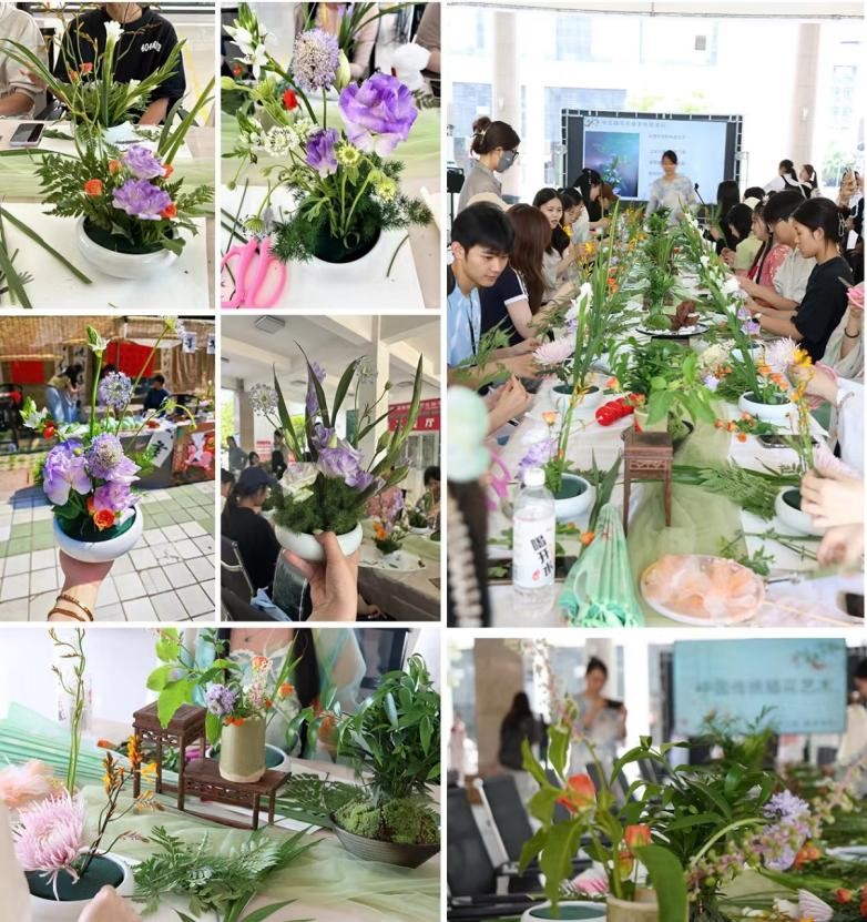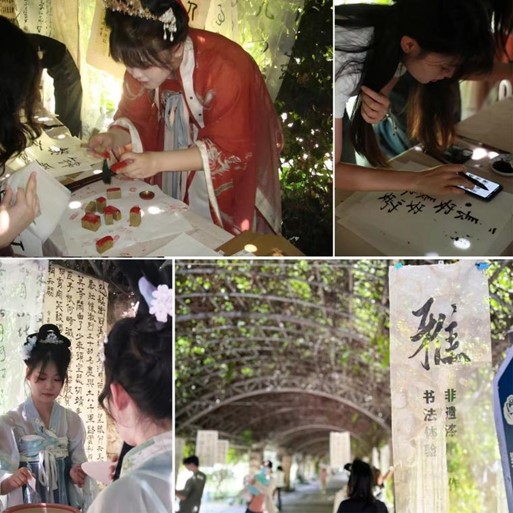 与此同时,游园会在学子长廊、五四广场伴以墨香诗意、品茗插花为邀,引众多学子驻足参与。游园活动以《诗经》中风、雅、颂三篇章内容为名,延申开展汉服妆造、茶肆文化、书法、漆扇、蹴鞠、空竹、宋式插花等多项美育体验活动,让同学们在切身参与游园会的过程中感受美、发现美、传播美。