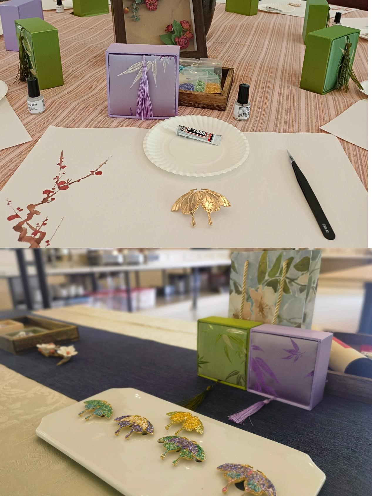 活动伊始,老师详细介绍了中国非遗传统工艺螺钿镶嵌的文化历史,带领大家认识手工材料并教授制作方法。活动在舒缓的音乐和香气弥漫的温馨氛围中进行。教师们将各自喜欢的螺钿贝壳挑选并分装于各自的盘中,经过心中精心设计和配色,再用专用工具慢慢粘到蝴蝶螺钿底胎上,让一只只蝴蝶“鲜活”起来。大家看着自己亲手创作的螺钿作品,脸上洋溢着幸福的笑容。一场有意义的非遗手工活动,让教师们在享受乐趣的同时,释放了压力,放松了心情。