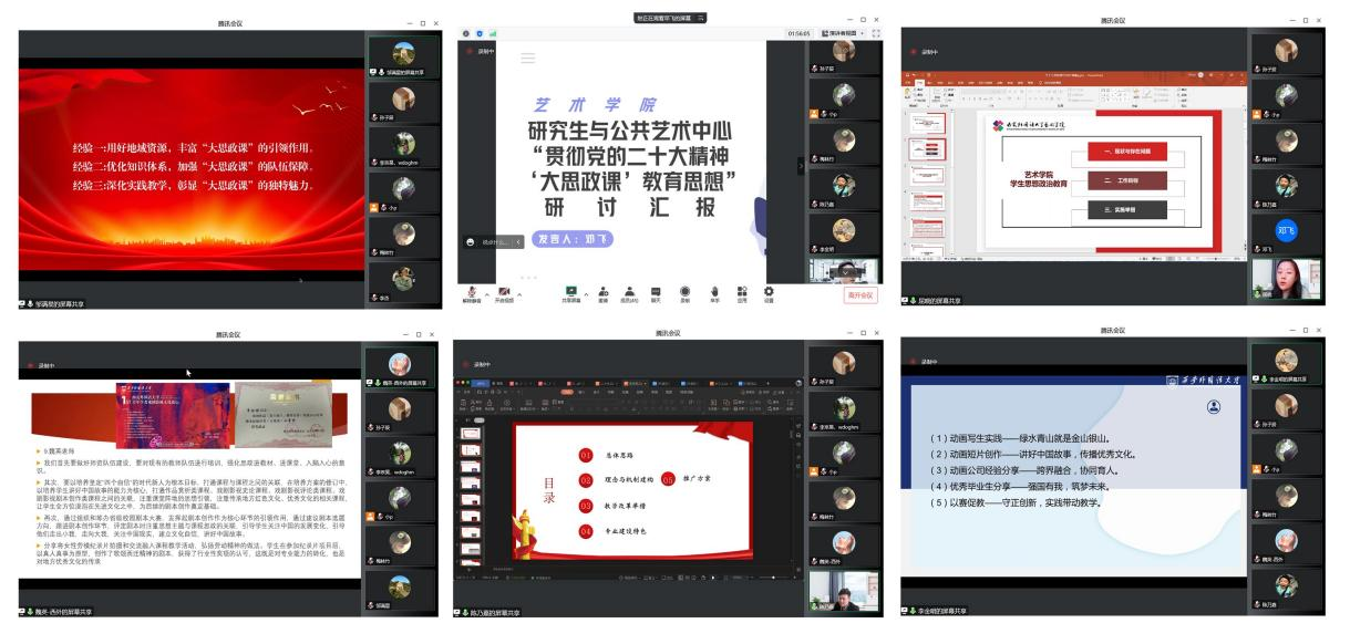 会上,副院长、视觉传达设计专业带头人邹满星,戏剧影视文学专业带头人魏英,表演专业带头人陈乃嘉,动画专业带头人李金明,副院长邓飞,党委副书记屈晓分别从四个本科专业、研究生教育、公共艺术中心以及学生思想政治工作的角度,对前期分组讨论情况,学院课程思政建设现状及存在问题,开展课程思政特色、经验、措施及成效,下一步工作目标和落实举措等方面进行汇报交流。