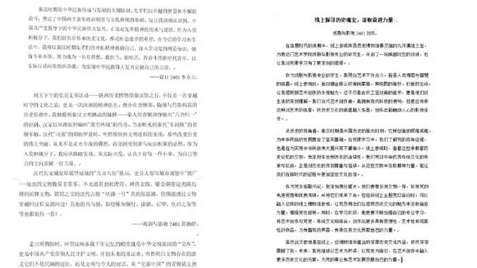 学院党委同步开设“指尖上的秦汉馆”线上学习专栏,精选馆藏文物高清影像、专家讲座视频及党课讲稿等资料。党员们云端学习,结合自身专业撰写心得体会,进行艺术创作。