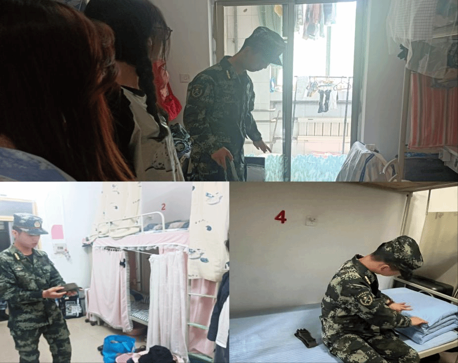 开展了军训内务整理活动。上午11点,教官们进入宿舍楼,指导新生整理内务。教官们按照军训标准,对宿舍物品摆放、被褥叠放、地面清扫提出了严格要求,并指出了在细节整理方面的注意事项。随后,教官们为同学们演示叠好军备的几个步骤,并一边示范一边讲解要理一床蓬松的棉被就再简单的叠压,几个动作之下变成了四四方方的豆腐块。
