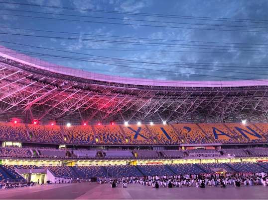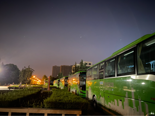 七月,因节目调整,我们原本舞蹈组的演员都转入了标兵的阵容,西外十四运开幕式群众演员们开始在同一个节目里共同奋斗。伴随着运动员进行曲的节拍,在足球场与文体馆挥汗如雨的日子一闪而过,我们迎来了第一次见到西安奥体中心体育场的机会。那一天,在凌晨三点的图书馆前,聚集了穿着统一,背后印着西安外国语大学的500多名学子们,虽然身体疲惫可大家都精神百倍,因为所有人都怀揣着同一个期待,一起去看看正式演出的场地。
