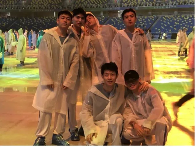 最让我印象深刻的事件一定是那天晚上的暴雨了。在一个平平无奇的夜晚,我们正在奥体中心训练,排练中突然下了暴雨,有很多同学都被困在了室外,无法回到休息区。我们标兵十组的男孩子们看到这样的情况,一次一次的跑出去给女孩们送伞、送雨衣,虽然最后我们全都被淋透了,但好像一点也感觉不到冷。我想,这一定是因为大家的凝聚力就好似一团火,让原本寒冷的空气都仿佛温暖了起来。那天晚上,我们用实际行动向所有参演高校展示了西外男生的勇气与担当。