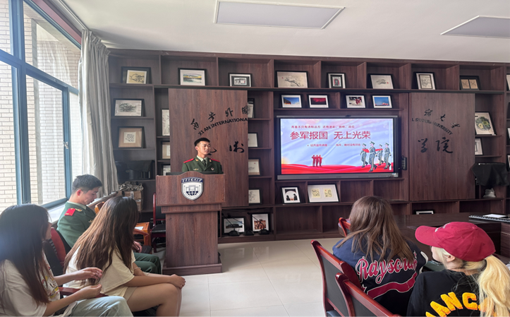 其次开展了退伍大学生征兵宣讲,分别由28连教官孙小峰和29连教官程思锦讲述了他们入伍当兵的故事。他们用自身经历和成长收获,为我们讲述了从军报国的初心使命,分享了部队“大熔炉”淬火成刚的青春故事。他们从不同角度,介绍了自己在军营里面的训练、生活、成长经历和军营感悟以及“以梦为马,不负韶华”弃笔从戎的家国情怀,让同学们真切感受到军营里的美好生活,并结合自身为大家讲解了参军入伍的基本常识和待遇,鼓励大家踊跃参军。最后用一个视频短片为大家展现了他们在军营里刻苦训练的日常。为大家诠释了“退伍不褪色,退役不退志”的退役军人品质,展现了新时代优秀军人的品质。