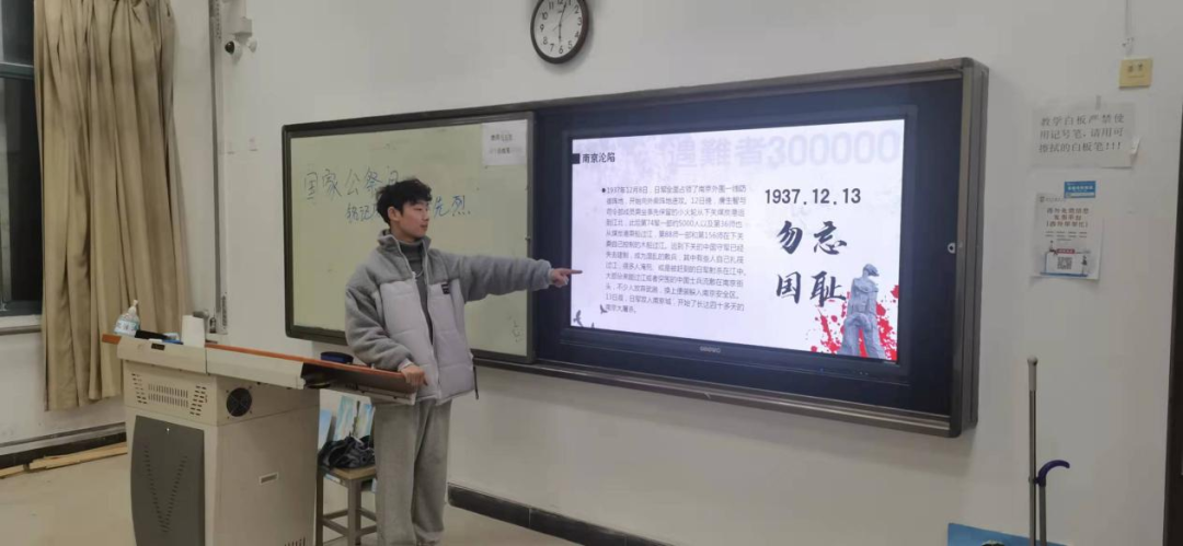 翟蕾蕾老师和同学们积极交流:“南京大屠杀的伤痛我们永远不会忘记,中国被欺辱的时代已经过去,我们更应该以史为鉴,珍惜当下幸福生活,不断前行。青年是祖国的希望,是我们实现伟大复兴的中坚力量,希望大家能够热爱祖国,为中华民族之崛起而不懈奋斗。”辅导员李婵希望同学们自主学习这段历史,以史为鉴,体会当下生活来之不易,当代大学生要热爱中国共产党、热爱我们的国家,热爱我们的母校,热爱我们的生活。用青年的担当、青年的力量,扛起中华民族伟大复兴的中国梦。