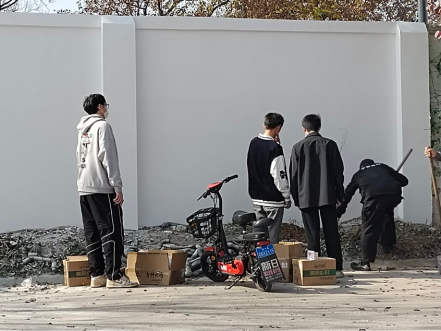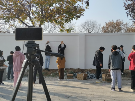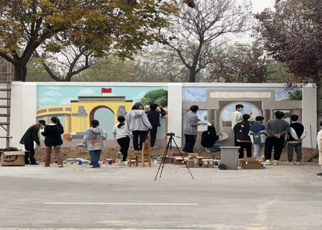 2022年11月18日下午,队内成员将绘画颜料,水桶,调色盘等绘画工具搬运到西门围墙。顶着寒风,志愿者们一手捧着颜料,一手握着刷笔,构图、描图、修整、上色……大家丝毫不敢怠慢,任何细节都不放过,做到精益求精。