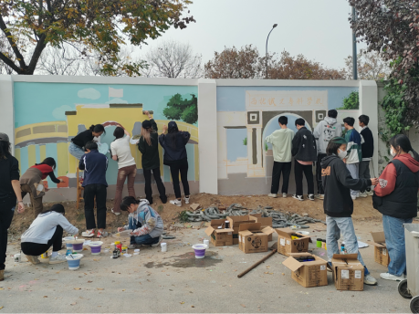 队员间分工明确,密切配合,在他们的精心绘制下,两幅构思独特、色彩亮丽,为学校量身绘制的图案终于在11月20日基本完成。志愿者们用手上的画笔为学校准备了一份“特别的礼物”白墙褪去沉闷与单调,旧貌换新颜,充满了艺术气息与青春活力,成为了校园里一道靓丽的风景线。