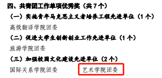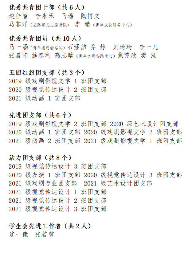 团委荣获“加强校园文化建设先进单位”。赵佳智、陶博文等6人荣获“优秀共青团干部称号”。施春利、乔静等10人获得“优秀共青团员”称号,张若馨、连一僮2人荣获“学生会组织先进工作者”称号。2019级戏剧影视文学1班团支部等3个团支部荣获“五四红旗团支部”。2019级戏剧影视文学2班团支部等6个团支部荣获“先进团支部”。2019 级视觉传达设计 3 班团支部 等8个团支部荣获“活力团支部”。