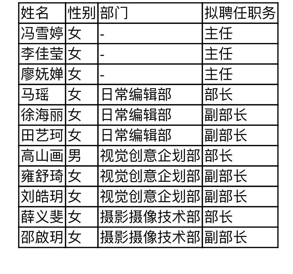 学生融媒体中心第二届学生干部拟任名单公示如下(排名不分前后):