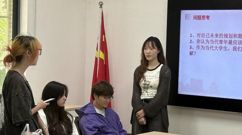 为弘扬五四主旋律,传播青春正能量,5月7日,视传2303班在公寓楼党团工作站1B104举办了以“燃强国梦想,做有为青年”为主题的班团文化进公寓活动。视传2303班班主任雷诺阿及2023级辅导员李欢欢参加本次活动,会议由王怡璇、张奕婷主持,全体同学参与。