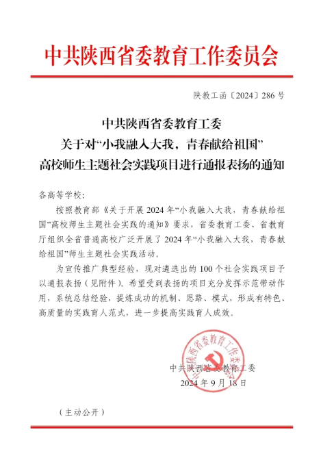 近日,中共陕西省委教育工委下发了《关于对“小我融入大我,青春献给祖国”高校师生主题社会实践项目进行通报表扬的通知》,开云体育