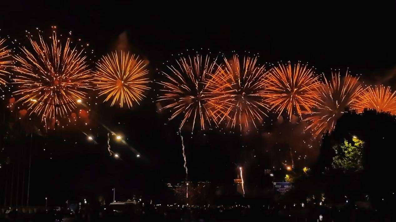 作品中记录下了烟花在空中盛开的瞬间,色彩斑斓的烟火呈现出一副绚丽多彩的画面。在这张照片中,烟花的形状各异,有的如花朵般绽放,有的似流星划过天际。摄影者用镜头语言表达了对祖国的美好祝愿。