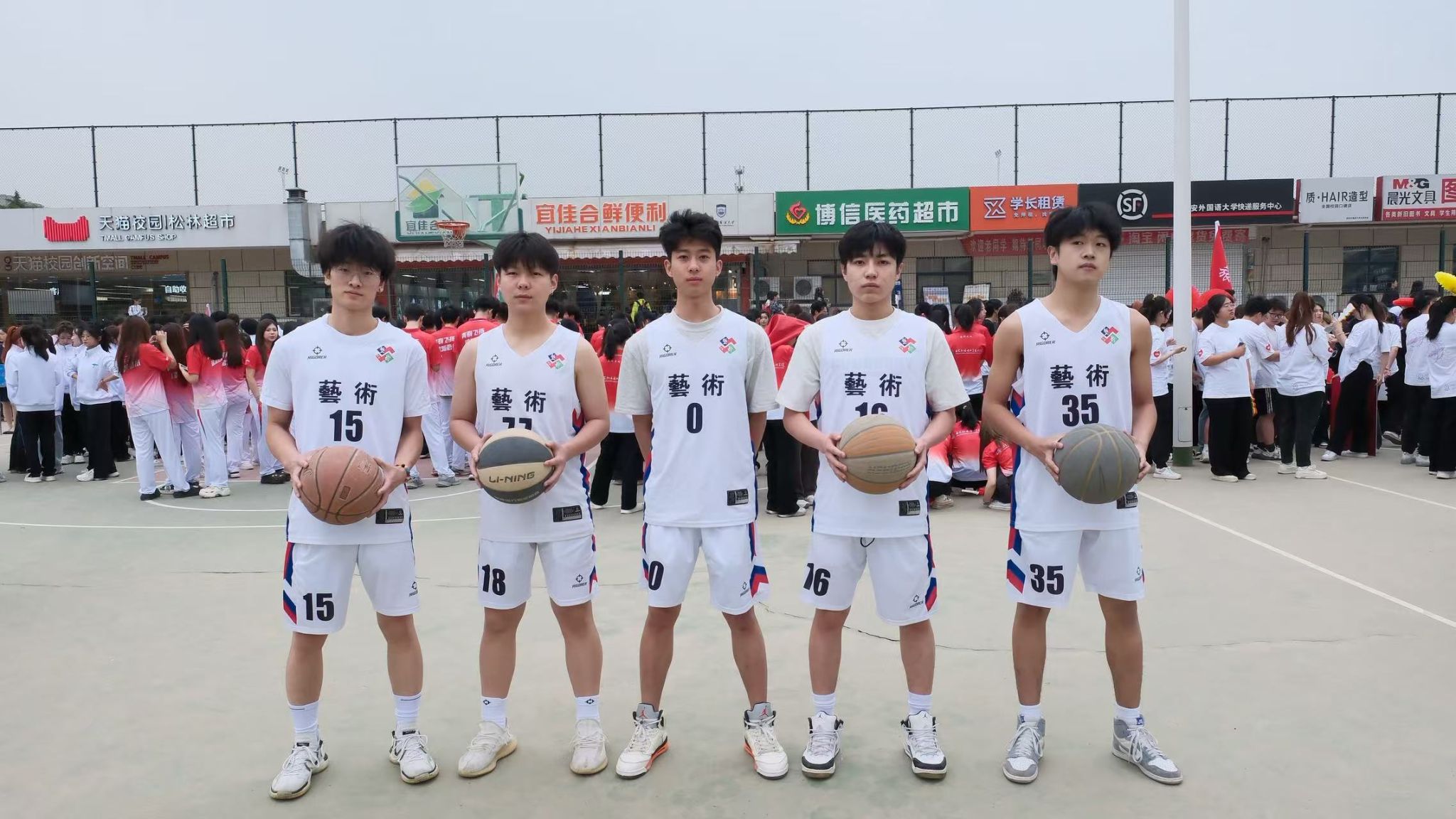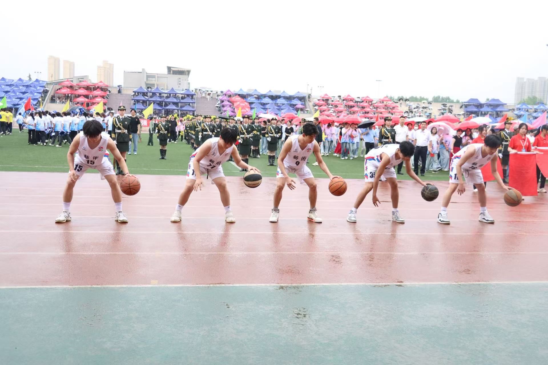 篮球健将们率先登场,五位在 2025 年校篮球联赛男子组斩获亚军的代表,身着白色球衣,在绿茵场上展开了一场力量与技巧的视觉盛宴。篮球在他们手中仿佛被赋予了灵魂,穿梭、腾挪、旋转,每一个动作都精准无误,每一次运球都伴随着风的呼啸。在他们矫健的身姿中,我们看到了艺术与体育的完美融合,那是速度与激情的碰撞,是对青春的致敬。