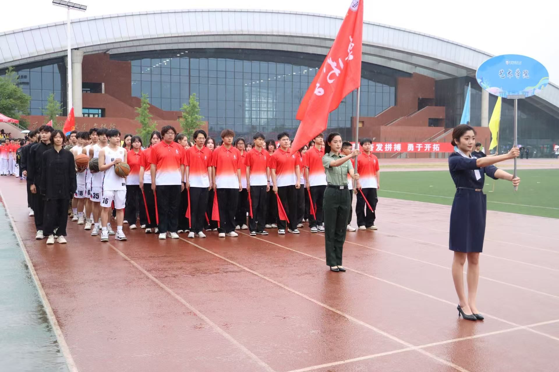 方阵宛如一颗璀璨星辰,闪耀着属于自己的光芒。83名艺院学子组成的方阵如浩荡长龙,沿着跑道徐徐行进。队列中,方阵主题 "精忠报国" 四字煌煌夺目,那是对艺术与责任的炽热宣言;口号 "艺心向党,艺帜飞扬,精忠报国,共赴荣光!" 如惊雷般在空旷场地炸响,那是他们青春的呐喊,是对梦想的执着追寻。