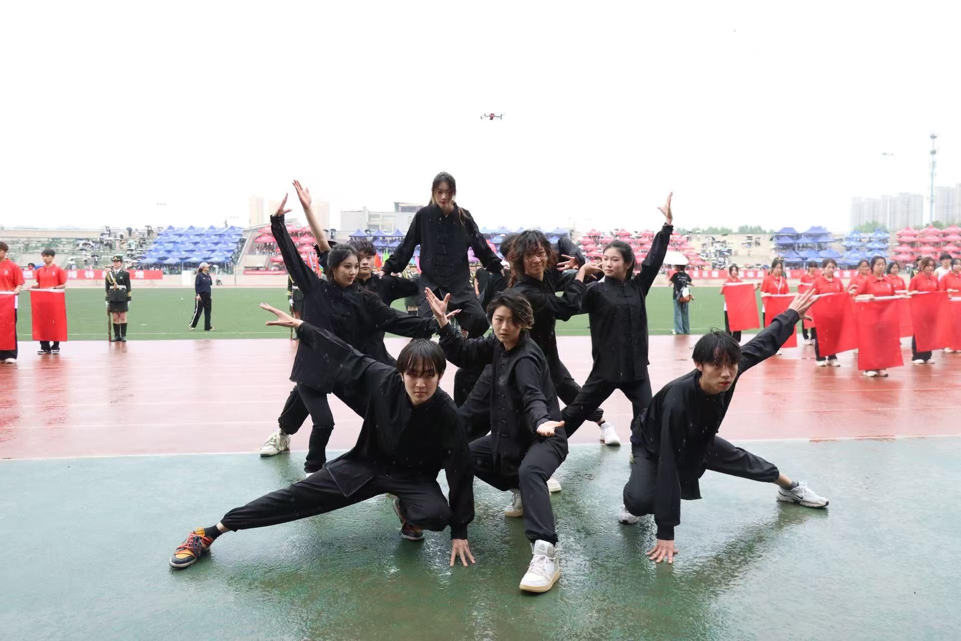 退伍军人方阵迈着铿锵有力的步伐踏上场地。他们身姿挺拔,眼神坚毅,如钢铁铸就。他们重现格斗训练,近身搏斗间尽显男子汉的阳刚之美。每一个动作都精准到位,每一个眼神都透露出保家卫国的决心。他们用行动诠释了 "精忠报国" 的含义,他们是校园中最可爱的人,用青春守护着和平。