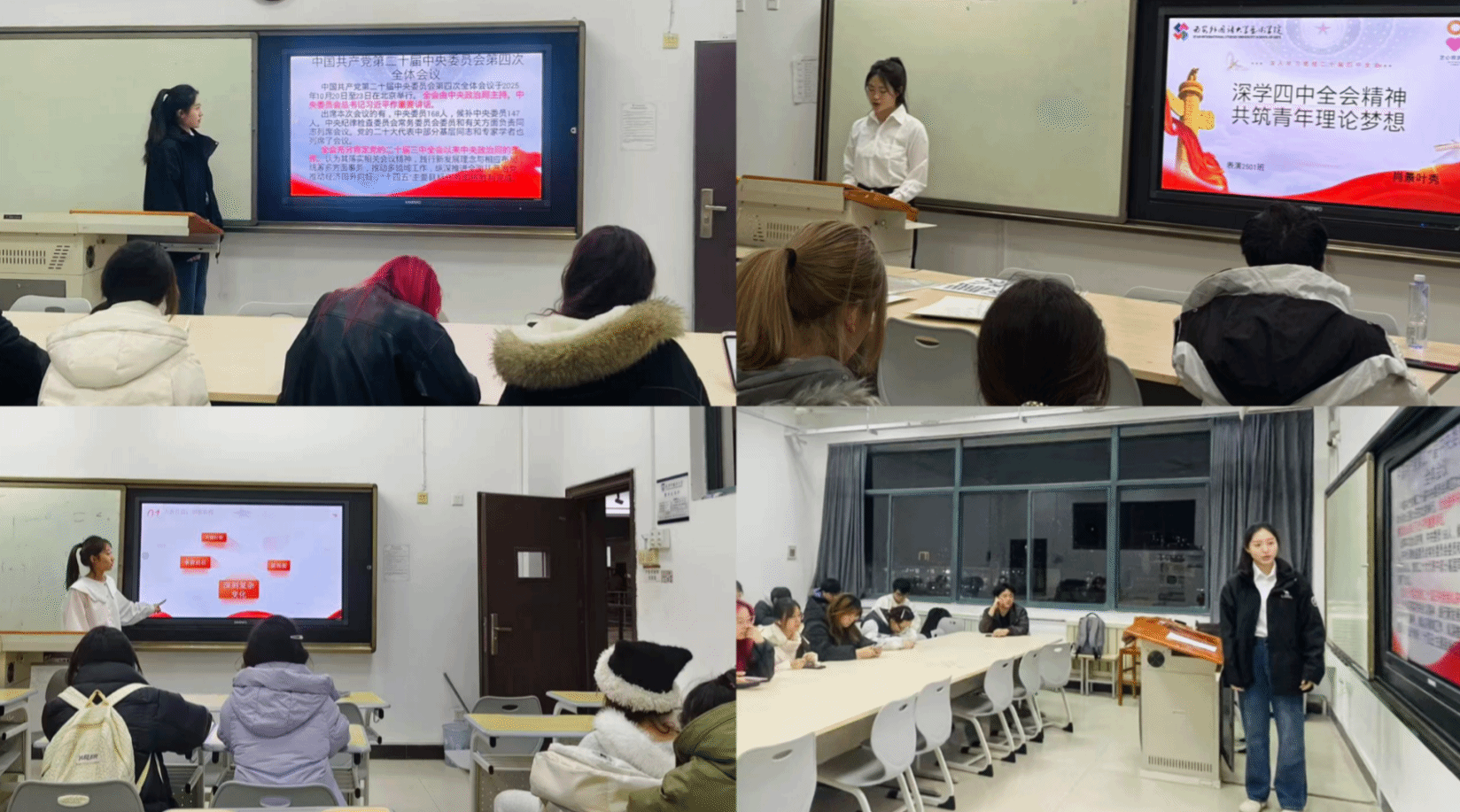 为深入学习宣传贯彻党的二十届四中全会精神,引导青年学子深刻把握以中国式现代化全面推进中华民族伟大复兴的宏伟蓝图,11月25日、27日晚,艺心筑梦理论研习社的四名宣讲员肖景叶秀、王佳荣、刘怡萱、陆思睿面向全体2025级新生开展了“深学四中全会精神,共筑青年理论梦想”主题宣讲会,与同学们共同学习党的二十届四中全会精神。宣讲员们以“相聚启程—主题深学—展望未来—思想碰撞”为脉络,分四大板块层层递进开展宣讲,让全会精神入脑入心。