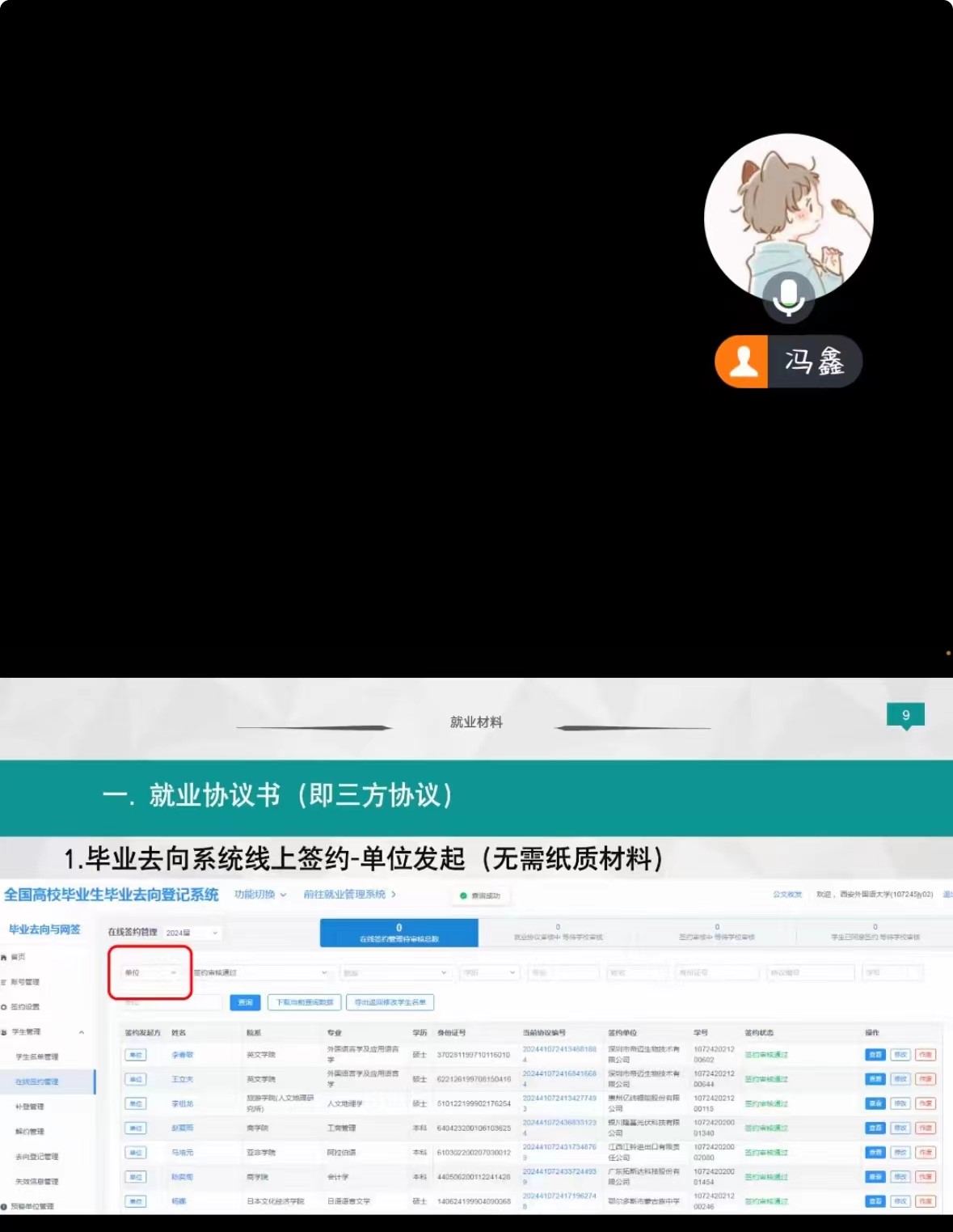 冯鑫为同学们梳理介绍了本学期毕业班重点工作、近期学校招聘安排、就业流程、就业材料登记等事项,并对就业协议填写、“三方协议书”签订、户口档案迁移、毕业去向登记系统使用等做了逐一说明,让同学们对就业、毕业流程中的重要时间点、政策及就业相关资源等有了明确的认识。