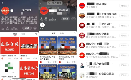 在一些社交平台上,不少求职者发帖求职、交流信息、分享经验。但在这些帖子下方的评论区,却经常有大量刷屏的留言,“私我走央企内部渠道”“落户名额看这里”,留言者通常是一些打着“央企国企工作安置”“落户职业顾问”旗号的个人或公司,向求职者暗示能够以非正常渠道解决工作落户问题。